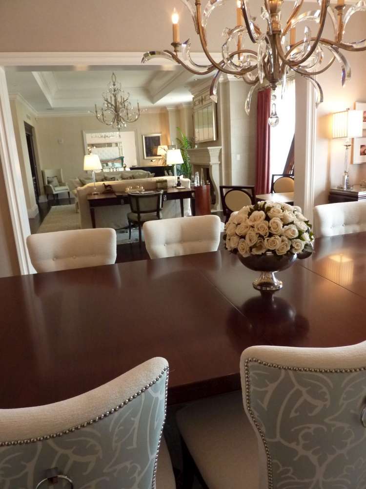 Throughout the suite, elegant crown moldings, handcrafted chandeliers and macasser ebony furnishings meld with a soothing color palette to define artful residential style. Hues of cream, taupe and mineral green along with sprays of fresh flowers create a soothing space made even more inviting with floor-to-ceiling windows.
